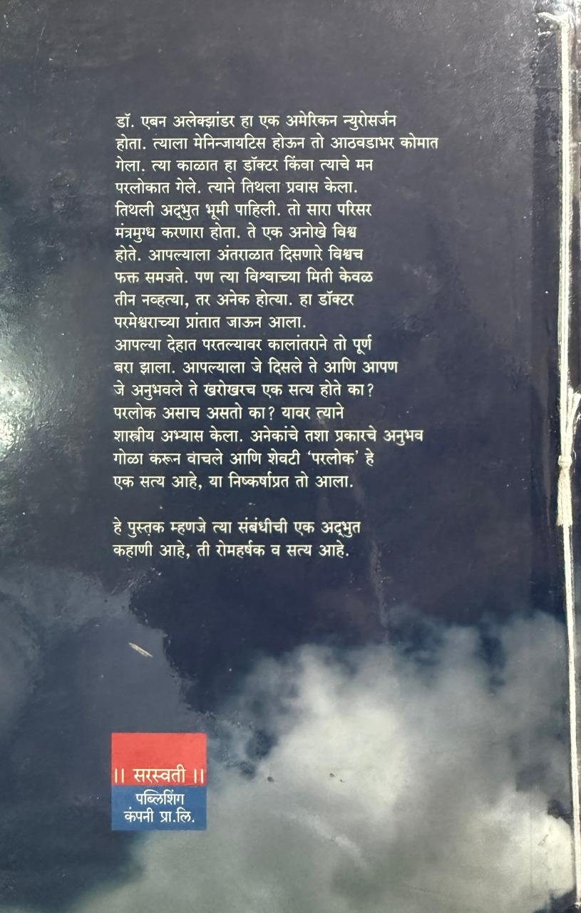 डॉक्टर एबन अलेक्झांडर हा एक अमेरिकन न्यूरोसर्जन होता. त्याला मेनिन्जायटिस होऊन तो आठवडाभर कोमात गेला. त्या काळात हा डॉक्टर किंवा त्याचे मन परलोकात गेले. त्याने तिथला प्रवास केला. तिथली अद्भुत भूमी पाहिली. तो सारा परिसर मंत्रमुग्ध करणार होता. ते एक अनोखे विश्व होते. आपल्याला अंतराळात दिसणारे विश्वच फक्त समजते. पण त्या विश्वाच्या मिती केवळ तीन नव्हत्या. तर अनेक होत्या. हा डॉक्टर परमेश्वराच्या प्रांतात जाऊन आला. आपल्या देहात परतल्यावर कालांतराने तो पूर्ण बरा झाला. आपल्याला जे दिसले ते आणि आपण जे अनुभवले ते खरोखरच एक सत्य होते का? परलोक असाच असतो का? यावर त्याने शास्त्रीय अभ्यास केला. अनेकांचे तशा प्रकारचे अनुभव गोळा करून वाचले आणि शेवटी "परलोक" हे एक सत्य आहे, या निष्कर्षाप्रत तो आला. हे पुस्तक म्हणजे त्यासंबंधीची एक अद्भुत कहाणी आहे, ती रोमहर्षक व सत्य आहे.
