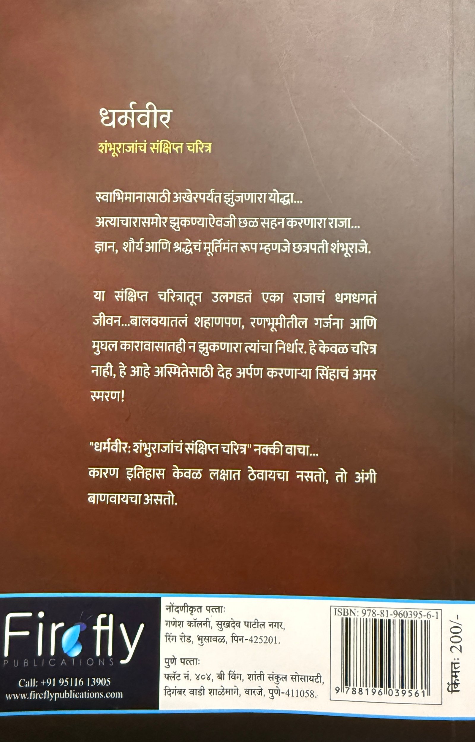 स्वाभिमानासाठी अखेरपर्यंत झुंजणारा योद्धा... अत्याचारासमोर झुकण्याऐवजी छळ सहन करणारा राजा....शौर्य आणि श्रद्धेचं मूर्तिमंत रूप म्हणजे छत्रपती शंभूराजे. ज्ञान, या संक्षिप्त चरित्रातून उलगडतं एका राजाचं धगधगतं जीवन.... बालवयातलं शहाणपण, रणभूमीतील गर्जना आणि मुघल कारावासातही न झुकणारा त्यांचा निर्धार. हे केवळ चरित्र नाही, हे आहे अस्मितेसाठी देह अर्पण करणाऱ्या सिंहाचं अमर स्मरण! "धर्मवीर: शंभुराजांचं संक्षिप्त चरित्र" नक्की वाचा...कारण इतिहास केवळ लक्षात ठेवायचा नसतो, तो अंगी बाणवायचा असतो.
