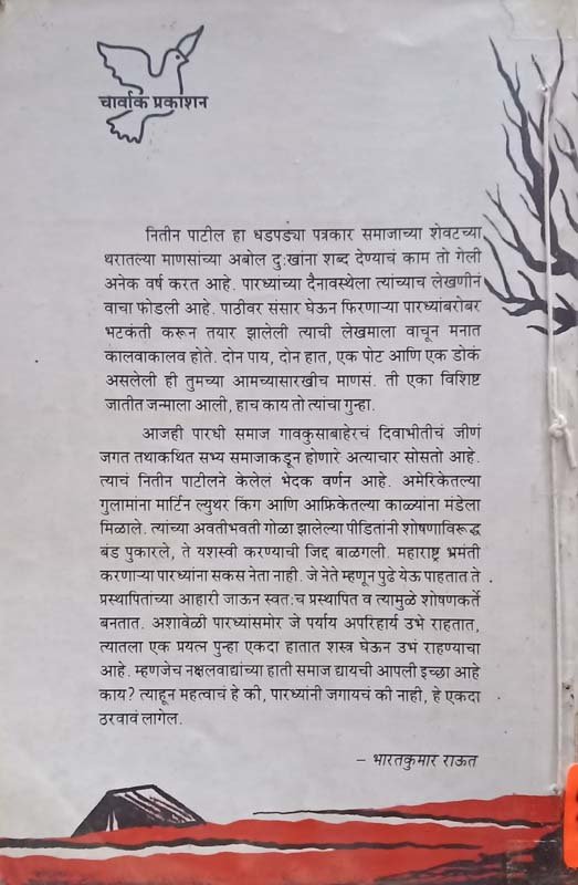 नितीन पाटील हा धडपड्या पत्रकार समाजाच्या शेवटच्या थरातल्या माणसांच्या अबोल दु:खांना शब्द देण्याचं काम तो गेली अनेक वर्ष करत आहे. पारध्यांच्या दैनावस्थेला त्यांच्याच लेखणीनं। वाचा फोडली आहे. पाठीवर संसार घेऊन फिरणाऱ्या पारध्यांबरोबर भटकंती करून तयार झालेली त्याची लेखमाला वाचून मनात कालवाकालव होते. दोन पाय, दोन हात, एक पोट आणि एक डोक असलेली ही तुमच्या आमच्यासारखीच माणसं. ती एका विशिष्ट जातीत जन्माला आली, हाच काय तो त्यांचा गुन्हा. आजही पारधी समाज गावकुसाबाहेरचं दिवाभीतीचं जीणं जगत तथाकथित सभ्य समाजाकडून होणारे अत्याचार सोसतो आहे. त्याचं नितीन पाटीलने केलेलं भेदक वर्णन आहे. अमेरिकेतल्या गुलामांना मार्टिन ल्युथर किंग आणि आफ्रिकेतल्या काळ्यांना मंडेला मिळाले. त्यांच्या अवतीभवती गोळा झालेल्या पीडितांनी शोषणाविरूद्ध बंड पुकारले, ते यशस्वी करण्याची जिद्द बाळगली. महाराष्ट्र भ्रमंती करणाऱ्या पारध्यांना सकस नेता नाही. जे नेते म्हणून पुढे येऊ पाहतात ते. प्रस्थापितांच्या आहारी जाऊन स्वतःच प्रस्थापित व त्यामुळे शोषणकर्ते बनतात. अशावेळी पारध्यांसमोर जे पर्याय अपरिहार्य उभे राहतात, त्यातला एक प्रयत्न पुन्हा एकदा हातात शस्त्र घेऊन उभं राहण्याचा आहे. म्हणजेच नक्षलवाद्यांच्या हाती समाज द्यायची आपली इच्छा आहे काय? त्याहून महत्वाचं हे की, पारध्यांनी जगायचं की नाही, हे एकदा ठरवावं लागेल.