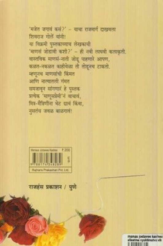 मजेत जगावं कसं?’ – याचा राजमार्ग दाखवला शिवराज गोर्ले यांनी! या विक्रमी पुस्तकाच्याच लेखकाची ‘माणसं जोडावी कशी?’ – ही नवी लाघवी कलाकृती. वास्तविक माणसं-नाती जोडू पाहणारे आपण, कळत-नकळत काहीवेळा ती तोडूनच टाकतो. म्हणूनच माणसांची किंमत आणि नात्यातली गंमत समजावून सांगणारं हे पुस्तक प्रत्येक ‘माणूसप्रेमी’नं वाचावं, मित्र-मैत्रिणींना भेट द्यावं किंवा, नुसतंच जवळ बाळगावं!
