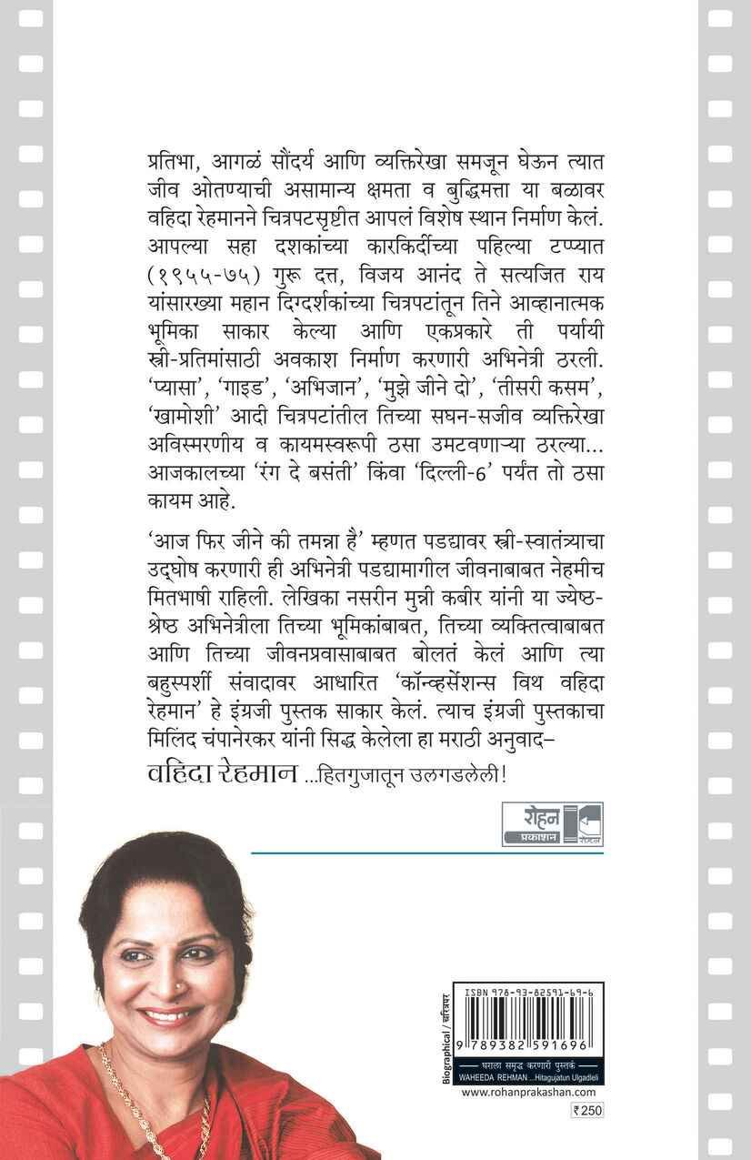 प्रतिभा, आगळं सौंदर्य आणि व्यक्तिरेखा समजून घेऊन त्यात जीव ओतण्याची असामान्य क्षमता व बुध्दिमत्ता या बळावर वहिदा रेहमानने चित्रपटसृष्टीत आपलं विशेष स्थान निर्माण केलं. आपल्या सहा दशकांच्या कारकिर्दीच्या पहिल्या टप्प्यात (१९५५-७५) गुरू दत्त, विजय आनंद ते सत्यजित राय यांसारख्या महान दिग्दर्शकांच्या चित्रपटांतून तिने आव्हानात्मक भूमिका साकार केल्या आणि एकप्रकारे ती पर्यायी स्त्री-प्रतिमांसाठी अवकाश निर्माण करणारी अभिनेत्री ठरली. 'प्यासा', 'गाइड', 'अभिजान', 'मुझे जीने दो', 'तीसरी कसम', 'खामोशी' आदी चित्रपटांतील तिच्या सघन-सजीव व्यक्तिरेखा अविस्मरणीय व कायमस्वरूपी ठसा उमटवणार्या ठरल्या... आजकालच्या 'रंग दे बसंती' किंवा 'दिल्ली-६' पर्यंत तो ठसा कायम आहे. 'आज फिर जीने की तमन्ना है' म्हणत पडद्यावर स्त्री-स्वातंत्र्याचा उद्धोष करणारी ही अभिनेत्री पडद्यामागील जीवनाबाबत नेहमीच मितभाषी राहिली. लेखिका नसरीन मुन्नी कबीर यांनी या ज्येष्ठ-श्रेष्ठ अभिनेत्रीला तिच्या भूमिकांबाबत, तिच्या व्यक्तित्वाबाबत आणि तिच्या जीवनप्रवासाबाबत बोलतं केलं आणि त्या बहुस्पर्शी संवादावर आधारित 'कॉन्व्हर्सेशन्स विथ वहिदा रेहमान' हे इंग्रजी पुस्तक साकार केलं. त्याच इंग्रजी पुस्तकाचा मिलिंद चंपानेरकर यांनी सिध्द केलेला हा मराठी अनुवाद- वहिदा रेहमान...हितगुजातून उलगडलेली!