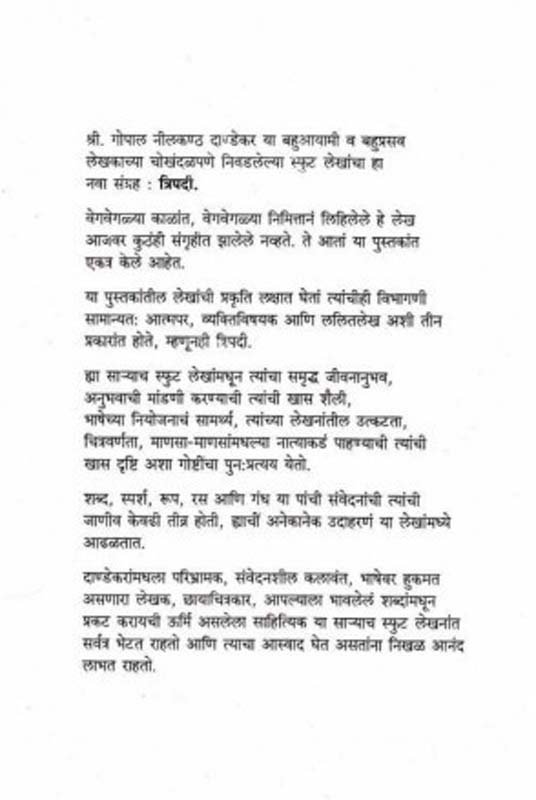 श्री. गोपाल नीलकण्ठ दाण्डेकर या बहुआयामी व बहुप्रसव लेखकाच्या चोखंदळपणे निवडलेल्या स्फुट लेखांचा हा नवा संग्रह : त्रिपदी. वेगवेगळ्या काळांत, वेगवेगळ्या निमित्तानं लिहिलेले हे लेख आजवर कुठंही संगृहीत झालेले नव्हते. ते आतां या पुस्तकांत एकत्र केले आहेत. या पुस्तकांतील लेखांची प्रकृति लक्षात घेतां त्यांचीही विभागणी सामान्यत: आत्मपर, व्यक्तिविषयक आणि ललितलेख अशी तीन प्रकारांत होते, म्हणूनही त्रिपदी. ह्या सार्याच स्फुट लेखांमधून त्यांचा समृध्द जीवनानुभव, अनुभवाची मांडणी करण्याची त्यांची खास शैली, भाषेच्या नियोजनाचं सामर्थ्य, त्यांच्या लेखनांतील उत्कटता, चित्रवर्णता, माणसा-माणसांमधल्या नात्याकडं पाहण्याची त्यांची खास दृष्टी अशा गोष्टींचा पुन:प्रत्यय येतो. शब्द, स्पर्श, रूप, रस आणि गंध या पांची संवेदनांची त्यांची जाणीव केवढी तीव्र होती, ह्यांचीं अनेकानेक उदाहरणं या लेखांमध्ये आढळतात. दाण्डेकरांमधला परिभ्रामक, संवेदनशील कलावंत, भाषेवर हुकुमत असणारा लेखक, छायाचित्रकार, आपल्याला भावलेलं शब्दांमधून प्रकट करायची ऊर्मि असलेला साहित्यिक या सार्याच स्फुट लेखनांत सर्वत्र भेटत राहतो आणि त्याचा आस्वाद घेत असतांना निखळ आनंद लाभत राहतो.