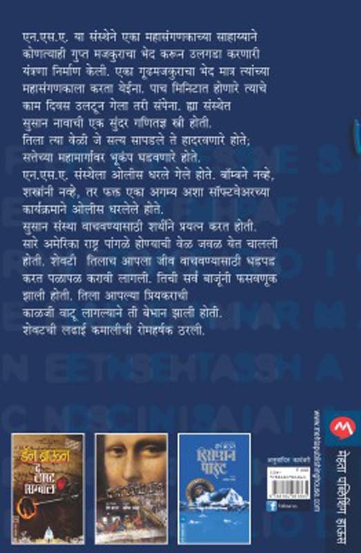 एन.एस.ए. या संस्थेने एका महासंगणकाच्या साहाय्याने कोणत्याही गुप्त मजकुराचा भेद करून उलगडा करणारी यंत्रणा निर्माण केली. एका गूढ मजकुराचा भेद मात्र त्यांच्या महासंगणकाला करता येईना. पाच मिनिटात होणारे त्याचे काम दिवस उलटून गेला तरी संपेना. ह्या संस्थेत सुसान नावाची एक सुंदर गणितज्ञ स्त्री होती. तिला त्या वेळी जे सत्य सापडले ते हादरवणारे होते; सत्तेच्या महामार्गावर भूकंप घडवणारे होते. एन.एस.ए. संस्थेला ओलीस धरले गेले होते. बॉम्बने नव्हे, शस्त्रांनी नव्हे, तर फक्त एका अगम्य अशा सॉफ्टवेअरच्या कार्यक्रमाने ओलीस धरलेले होते. सुसान संस्था वाचवण्यासाठी शर्थीने प्रयत्न करत होती. सारे अमेरिका राष्ट्र पांगळे होण्याची वेळ जवळ येत चालली होती. शेवटी तिलाच आपला जीव वाचवण्यासाठी धडपड करत पळापळ करावी लागली. तिची सर्व बाजूंनी फसवणूक झाली होती. तिला आपल्या प्रियकराची काळजी वाटू लागल्याने ती बेभान झाली होती. शेवटची लढाई कमालीची रोमहर्षक ठरली. शेवटी काय झाले? ते या खिळवून ठेवणा-या, श्री. अशोक पाध्ये यांनी आपल्या खास शैलीत अनुवाद केलेल्या कादंबरीत वाचा.