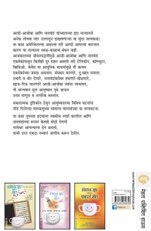 आजीआजोबा आणि नातवंडं यांच्यातल्या हृद्य नात्यातले अनेक लोभस पदर उलगडून दाखवणाया या सुंदर सत्यकथा! या कथा अमेरिकेतल्या असल्या तरी अगदी आपल्या वाटतात. कारण या नात्याला स्थळकाळाचं बंधन नाही. आजकालच्या जीवनपद्धतींमुळे आजीआजोबा आणि नातवंडं एकमेकांपासून कितीही दूर राहत असली तरी टेलिफोन, कॉम्प्युटर, व्हिडिओ, कॅमेरा या आधुनिक साधनांमुळे ती कायम एकमेकांच्या जवळ असतात. संस्कार करणारे, दु:खात मनाला उभारी व धीर देणारे, नातवंडांबरोबर हसणारेखेळणारे, खाऊपिऊ घालणारे आजीआजोबा ज्यांना लाभतात, ती भाग्यवान मुलं आयुष्यात पुढे जाऊन उत्तम माणूस व नागरिक बनतात. सकारात्मक दृष्टिकोन ठेवून आयुष्यातल्या विविध घटनांना तोंड दिलेल्या साध्यासुध्या सामान्य माणसांच्या या सत्यघटना. या कथा तुमच्या हृदयाला नक्कीच स्पर्श करतील आणि नातवंडांच्या रूपानं केवढी मोठी देणगी परमेश्वर आपल्याला देत असतो, याची परत एकदा नव्यानं जाणीव करून देतील.