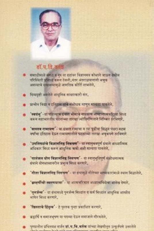 समाधीमध्ये मंगळ व गुरु या ग्रहांवर विज्ञानमय कोशाने जाऊन तेथील परिस्थिती प्रसिध्द करून ठेवली, नंतर अंतराळ्यानांनी अचुक असल्याचे दाखवल्यामुळे जागतिक कीर्ति लाभलेले. दिव्यदृष्टी असलेले आधुनिक साक्षात्कारी संत. प्राचीन विद्या व इतिहास यांचे संशोधक म्हणून मान्यता पावलेले. "स्वयंभू" - या पहिल्याच ग्रंथात भीमाचे नायकत्व आव्हानत्मकरित्या सिध्द करून महाभारतीय घटनांच्या तारखा ज्योतिर्गणिताने निश्चित ठरविणारे. "वास्तव रामायण" या ग्रंथात रामाचा व त्या पूर्वीचा मिळून पंधरा सहस्त्र वर्षांचा इतिहास देऊन रामायणातील घटनांच्या तारखा अचूकपणे ठरविणारे. "उपनिषदांचे विज्ञाननिष्ठ निरुपण" - या स्वानुभवपूर्ण ग्रंथाने आध्यात्मिक अधिकार सिध्द करून आधुनिक ऋषी अशी मान्यता पावलेले. "पातंजल योग - विज्ञाननिष्ठ निरुपण" या स्वानुभूतिपूर्ण संशोधनात्मक ग्रंथाने योगशास्त्रावरील प्रभुत्व सिध्द करणारे. "गीता - विज्ञाननिष्ठ निरुपण" या ग्रंथामुळे गीतेच्या भाष्यकारांमध्ये स्थान मिळालेले. "ब्रम्हर्षीची स्मरणयात्रा"- या आत्मचरित्रात अध्यात्मविद्येचा आलेख देणारे. "पुनर्जन्म"- या ग्रंथामध्ये पुनर्जन्म सिध्दान्त व कर्म सिध्दांत आधुनिक शास्त्रीय भाषेत सिध्द करणारे. "ख्रिस्ताचे हिंदुत्व" हे पुस्तक पुन्हा प्रकाशित करणारे. ब्रम्हर्षि व समाजभूषण या पदव्या देऊन समाजाने गौरवलेले. पुण्यातील प्रथितयश सर्जन डॉ. प. वि. वर्तक यांच्या लेखणीतून उत्स्फूर्तपणे उतरलेले थोरले बाजीराव पेशवे यांचे सत्य इतिहासावर आधारित नाट्य चरित्र.