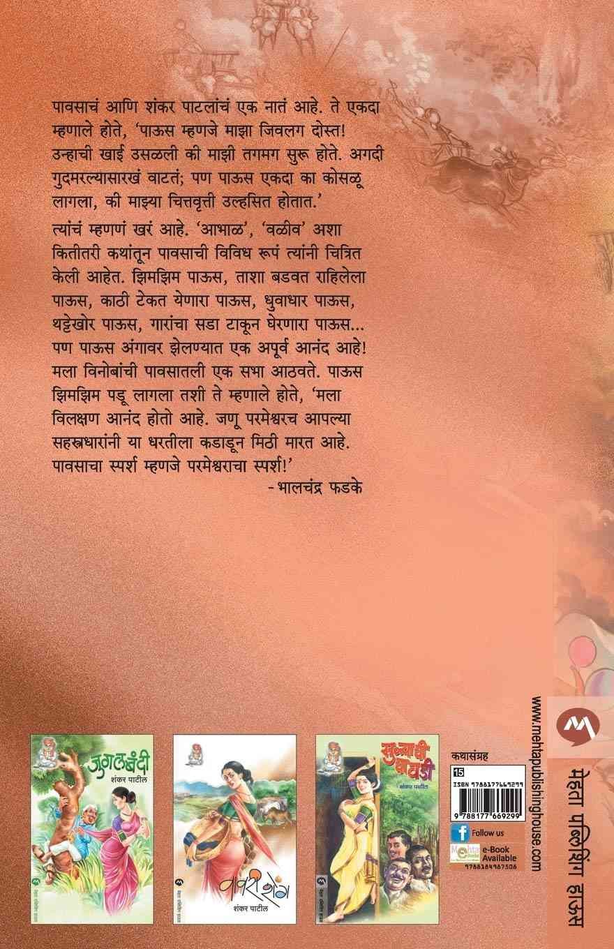 पावसाचं आणि शंकर पाटलांचं एक नातं आहे. ते एकदा म्हणाले होते, ‘पाऊस म्हणजे माझा जिवलग दोस्त! उन्हाची खाई उसळली की माझी तगमग सुरू होते. अगदी गुदमरल्यासारखं वाटतं; पण पाऊस एकदा का कोसळू लागला, की माझ्या चित्तवृत्ती उल्हसित होतात.’ त्यांचं म्हणणं खरं आहे. ‘आभाळ’, ‘वळीव’ अशा कितीतरी कथांतून पावसाची विविध रूपं त्यांनी चित्रित केली आहेत. झिमझिम पाऊस, ताशा बडवत राहिलेला पाऊस, काठी टेकत येणारा पाऊस, धुवाधार पाऊस, थट्टेखोर पाऊस, गारांचा सडा टाकून घेरणारा पाऊस... पण पाऊस अंगावर झेलण्यात एक अपूर्व आनंद आहे! मला विनोबांची पावसातली एक सभा आठवते. पाऊस झिमझिम पडू लागला तशी ते म्हणाले होते, ‘मला विलक्षण आनंद होतो आहे. जणू परमेश्वरच आपल्या सहस्त्रधारांनी या धरतीला कडाडून मिठी मारत आहे. पावसाचा स्पर्श म्हणजे परमेश्वराचा स्पर्श!’ –भालचंद्र फडके