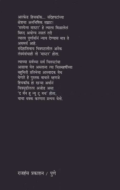 आल्फ्रेड हिचकॉक…संदेहपटांच्या क्षेत्राचा अनभिषिक्त सम्राट! `सम्राट मास्टर’ हे त्याला मिळालेलं बिरूद अयोग्य नसलं तरी त्याला पूर्णार्थानं न्याय देण्यास मात्र ते असमर्थ आहे. संदेहाशिवाय चित्रपटातील अनेक तंत्रमंत्रांचाही तो `मास्टर’ होता. त्याच्या सर्वच्या सर्व चित्रपटांचा आढावा घेत असताना त्या चित्रमहर्षीच्या बहुमिती प्रतिभेचा आस्वादक वेध घेणारे हे पुस्तक वाचले म्हणजे हिचकॉक हा ख-या अर्थानं चित्रसृष्टीतला हा ख-या अर्थानं चित्रसृष्टीतला अजोड असा `द मॅन हू न्यू टू मच’ होता, या थक्क करणारा प्रत्यय येतो.