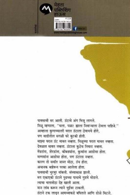 पावसाची सर आली. उंटाचे अंग भिजू लागले. निळू म्हणाला, “चला, पळा! ह्याला निवार्याला ठेवला पाहिजे.” पण वाडीतील सगळी घरे बुटकी होती. माझ्या घरात उंट मावत नव्ह्ता. निळूच्या घरात मावत नव्हता. देवळात मावत नव्हता. उंटाला कुठेच निवारा नव्हता. मेंढरांना, शेरडांना, कोंबड्यांना, कुत्र्यांना आडोसा होता. माणसांना आडोसा होता, पण उंटाला नव्हता. कारण तो सर्वांत जास्त मोठा, उंच होता. अचानक बाहेरून परका आलेला होता. पावसाची भुरभुर थांबली. संध्याकाळ झाली. मग एकाएकी उंटाने पुढच्या पायाचे गुडघे मोडले. त्याचा भला मोठा देह खाली आला. मान लांब करून त्याने भुईवर टाकली. उंटाने टक लावून आमच्याकडे बघितले आणि डोळे मिटले.
