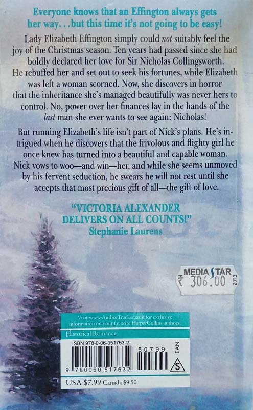Everyone knows that an Effington always getsher way ... but this time it's not going to be easy! Lady Elizabeth Effington simply could not suitably feel the joy of the Christmas season. Ten years had passed since she had boldly declared her love for Sir Nicholas Collingsworth. He rebuffed her and set out to seek his fortunes, while Elizabeth was left a woman scorned. Now, she discovers in horror that the inheritance she's managed beautifully was never hers to control. No, power over her finances lay in the hands of the last man she ever wants to see again: Nicholas! But running Elizabeth's life isn't part of Nick's plans. He's intrigued when he discovers that the frivolous and flighty girl he once knew has turned into a beautiful and capable woman. Nick vows to woo -- and win -- her, and while she seems unmoved by his fervent seduction, he swears he will not rest until she accepts that most precious gift of all -- the gift of love.