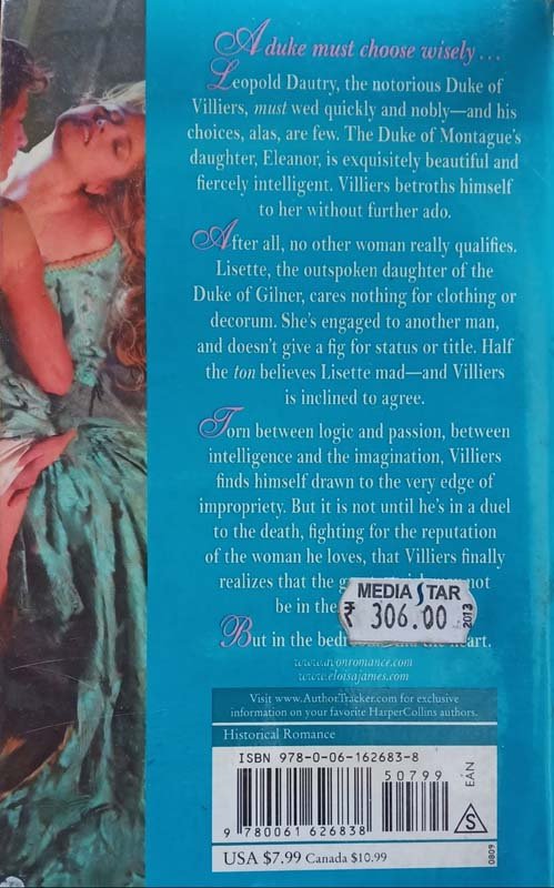 Leopold Dautry, the notorious Duke of Villiers, must wed quickly and nobly—and his choices, alas, are few. The Duke of Montague's daughter, Eleanor, is exquisitely beautiful and fiercely intelligent. Villiers betroths himself to her without further ado. After all, no other woman really qualifies. Lisette, the outspoken daughter of the Duke of Gilner, cares nothing for clothing or decorum. She's engaged to another man, and doesn't give a fig for status or title. Half the ton believes Lisette mad—and Villiers is inclined to agree. Torn between logic and passion, between intelligence and imagination, Villiers finds himself drawn to the very edge of impropriety. But it is not until he's in a duel to the death, fighting for the reputation of the woman he loves, that Villiers finally realizes that the greatest risk may not be in the dueling field . . . But in the bedroom. And the heart.