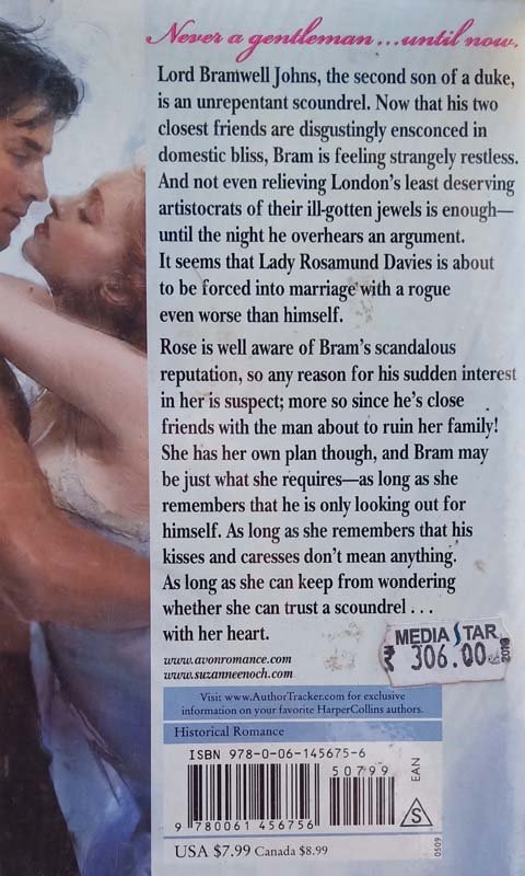 Never a gentleman . . . until now. Lord Bramwell Johns, the second son of a duke, is an unrepentant scoundrel. Now that his two closest friends are disgustingly ensconced in domestic bliss, Bram is feeling strangely restless. And not even relieving London's least deserving artistocrats of their ill-gotten jewels is enough—until the night he overhears an argument. It seems that Lady Rosamund Davies is about to be forced into marriage with a rogue even worse than himself. Rose is well aware of Bram's scandalous reputation, so any reason for his sudden interest in her is suspect; more so since he's close friends with the man about to ruin her family! She has her own plan though, and Bram may be just what she requires—as long as she remembers that he is only looking out for himself. As long as she remembers that his kisses and caresses don't mean anything. As long as she can keep from wondering whether she can trust a scoundrel . . . with her heart.