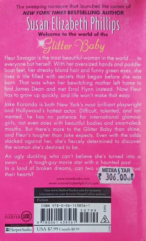 Welcome to the world of the Glitter Baby, Fleur Savagar is the most beautiful woman in the world . . . to everyone but herself. With her oversized hands and paddle-boat feet, her streaky blond hair and funny green eyes, she lives a life filled with secrets that began before she was born. That was when her bewitching mother left home to find James Dean and met Errol Flynn instead. Now Fleur has to grow up quickly, and life won't make that easy. Jake Koranda is both New York's most brilliant playwright and Hollywood's hottest actor. Difficult, talented, and tormented, he has no patience for international glamour girls, not even ones with beautiful bodies and smart-aleck mouths. But there's more to the Glitter Baby than shine, and Fleur's tougher than Jake expects. Even with the odds stacked against her, she's fiercely determined to discover the woman she's destined to be. An ugly duckling who can't believe she's turned into a swan . . . A tough-guy movie star with a haunted past . . . In a land of broken dreams, can two unlikely lovers trust their hearts?
