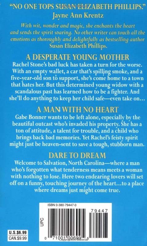 A Desperate Young Mother Rachel Stone's bad luck has taken a turn for the worse. With an empty wallet, a car's that's spilling smoke, and a five-year-old son to support, she's come home to a town that hates her. But this determined young widow with a scandalous past has learned how to be a fighter. And she'll do anything to keep her child safe—even take on. . . A man With No Heart Gabe Bonner wants to be left alone, especially by the beautiful outcast who's invaded his property. She has a ton of attitude, a talent for trouble, and a child who brings back bad memories. Yet Rachel's feisty spirit might just be heaven-sent to save a tough, stubborn man. Dare To Dream Welcome to Salvation, North Carolina—where a man who's forgotten what tenderness means meets a woman with nothing to lose. here two endearing lovers will set off on a funny, touching journey of the heart. . .to a place where dreams just might come true.