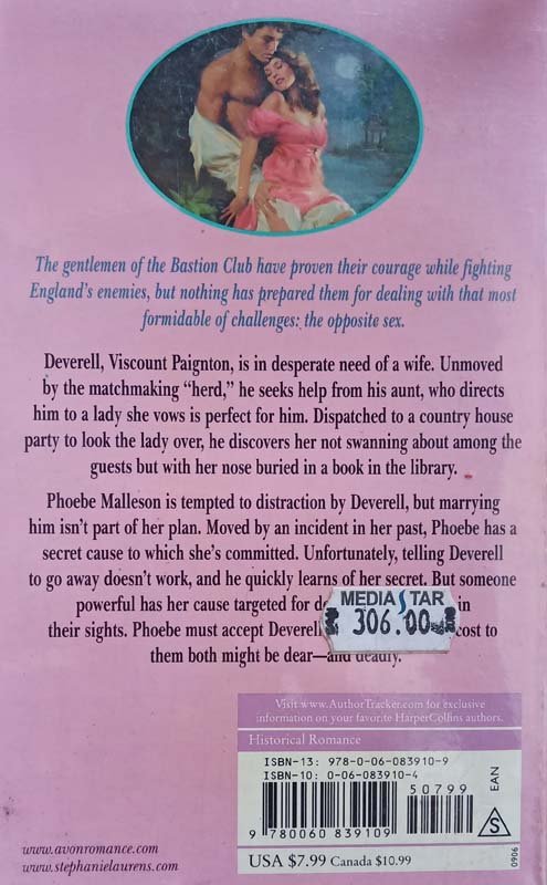 The gentlemen of the Bastion Club have proven their courage while fighting England's enemies, but nothing has prepared them for dealing with that most formidable of challenges: the opposite sex. Deverell, Viscount Paignton, is in desperate need of a wife. Unmoved by the matchmaking “herd,” he seeks help from his aunt, who directs him to a lady she vows is perfect for him. Dispatched to a country house party to look the lady over, he discovers her not swanning about among the guests but with her nose buried in a book in the library. Phoebe Malleson is tempted to distraction by Deverell, but marrying him isn't part of her plan. Moved by an incident in her past, Phoebe has a secret cause to which she's committed. Unfortunately, telling Deverell to go away doesn't work, and he quickly learns of her secret. But someone powerful has her cause targeted for destruction and her in their sights. Phoebe must accept Deverell's help…though the cost to them both might be dear and deadly.