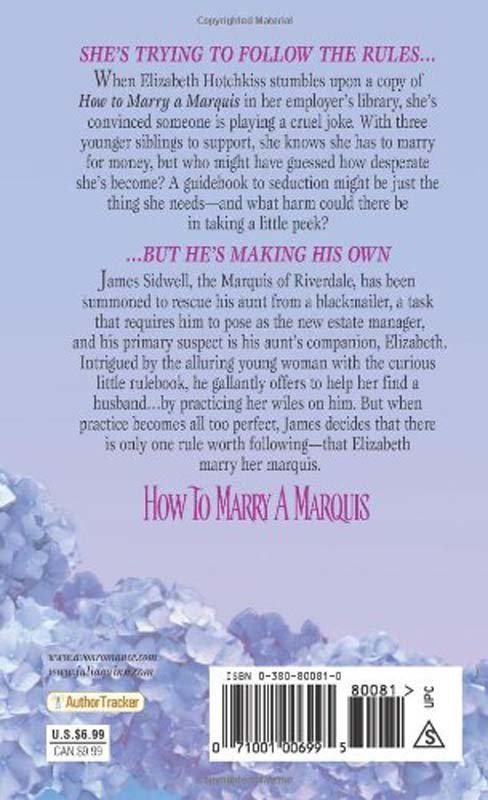 When Elizabeth Hotchkiss stumbles upon a copy of HOW TO MARRY A MARQUIS in her employer's library, she's convinced someone is playing a cruel joke. With three younger siblings to support, she knows she has to marry for money, but who might have guessed how desperate she's become? A guidebook to seduction might be just the thing she needs - and what harm could there be in taking a little peek? James Sidwell, the Marquis of Riverdale, has been summoned to rescue his aunt from a blackmailer, a task that requires him to pose as the new estate manager, and his primary suspect is his aunt's companion, Elizabeth. Intrigued by the alluring young woman with the curious little rulebook, he gallantly offers to help her find a husband ... by practicing her wiles on him. But when practise becomes all too perfect, James decides that there is only one rule worth following - that Elizabeth marry her marquis.