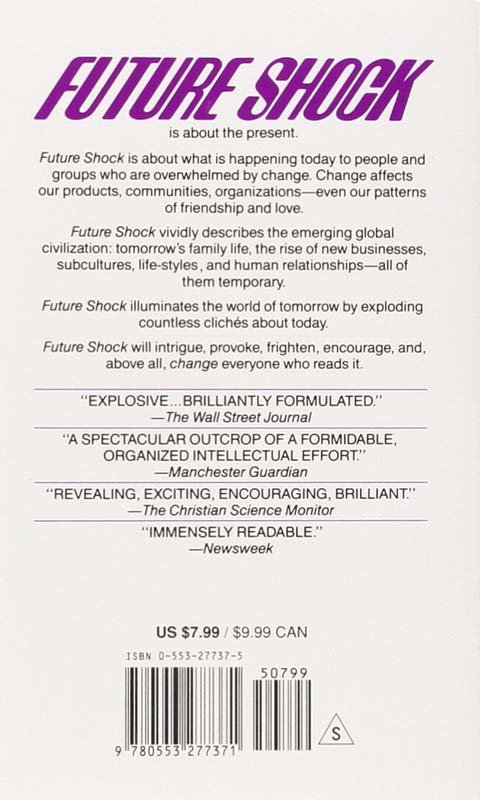 Future Shock is about the present. Future Shock is about what is happening today to people and groups who are overwhelmed by change. Change affects our products, communities, organizations—even our patterns of friendship and love. Future Shock vividly describes the emerging global civilization: tomorrow’s family life, the rise of new businesses, subcultures, life-styles, and human relationships—all of them temporary. Future Shock illuminates the world of tomorrow by exploding countless clichés about today. Future Shock will intrigue, provoke, frighten, encourage, and, above all, change everyone who reads it.