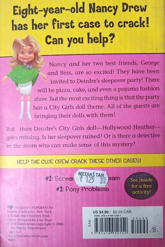 Nancy and her two best friends, George and Bess, are so excited! They have been invited to Deirdre's sleepover party! There will be pizza, cake, and even a pajama fashion show. But the most exciting thing is that the party has a City Girls doll theme. All of the guests are bringing their dolls with them! But then Deirdre's City Girls doll -- Hollywood Heather -- goes missing. Is her sleepover ruined? Or is there a detective in the room who can make sense of this mystery?