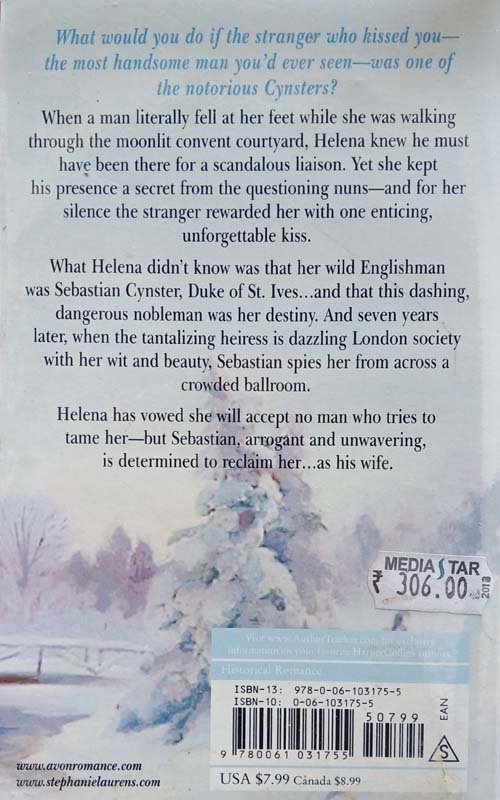 What would you do if you were kissed by the most handsome stranger you'd ever seen? And what if that man was a Cynster? Every girl—even convent-educated ones—dreams of forbidden kisses. So when a man literally falls at Helena's feet as she's walking through the courtyard one moonlit Christmas Eve, the pretty, young comtesse d'Lisle knows he's up to no good. He's clearly a bit dangerous... and obviously caught in the middle of a clandestine rendezvous. Why else would he have risked his neck and jumped out of a window into the snow? It's wrong, it's outlandish . . . and it's the most utterly romantic gesture she's ever seen. So when the good sisters rush up, demanding to know ifshe has seen a man on the grounds, Helena ignores the years of strict upbringing that insist she reveal his presence. To lie would be a sin, but 'no one can be good all the time. As a reward for her silence, the stranger takes her in his arms and enticingly, unforgettably kisses her—and then departs, leaving a lingering if unspoken promise of all that might be, should fate decree that they meet again. Although Helena doesn't know it, her wild Englishman is Sebastian Cynster, Duke of St. Ives, a nobleman who will prove to be her destiny. Seven years later, Helena has been transformed from a pretty schoolgirl to an aristocratic beauty. Her sparkling wit has made her sought after by London's hostesses; her considerable dowry has made winning her hand the aim of many a gentleman . . . but she is deadeningly aware of how boring so many ofthese gentlemen are. Her manipulative guardian has unexpectedly allowed her to find a husband of her own choosing, and she has no intention of marrying any man who tries to tame her. There must be someone perfect for her . . . someone who can live up to the promise ofthat long-ago kiss. Then, at a ball, fate strikes. Once again, it is the Christmas season, and across the crowded room Helena stands transfixed . . . for there is the man whose kiss she has never forgotten, the man of her memory whom no other has ever been able to supplant. Her wild, mysterious Englishman, Sebastian Cynster, Duke of St. Ives. One look, and he's determined to reclaim her . . . .