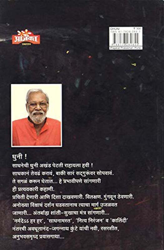 धुनी! साधनेची धुनी अखंड पेटती राहायला हवी! साधकानं तेवढं करावं, बाकी सारं सद्गुरूंवर सोपवावं. ते सगळं करून घेतात... हे प्रभावीपणे सांगणारी ही प्रत्ययकारी कहाणी. प्रचिती देणारी आणि दिशा दाखवणारी. विलक्षण. गुंगवून ठेवणारी. अनोख्या विश्वाचं दर्शन घडवतानाच त्याचा मार्ग उजळवत जाणारी... अंतर्बाहय शांती-सुखाचा मंत्र सांगणारी... ’नर्मदे हर हर’ ’साधनामस्त’, ’नित्य निरंजन’ व ’कालिंदी’ नंतरची अवधूतानंद-जगन्नाथ कुंटे यांची नवी, रसरशीत, अनुभवसमृद्ध प्रवासगाथा...