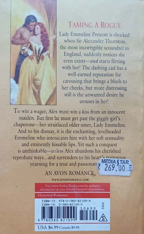 Taming a Rogue Lady Emmeline Prescott is shocked when Sir Alexander Thornton, the most incorrigible scoundrel in England, suddenly notices she even exists-and starts flirting with her! The dashing cad has a well-earned reputation for carousing that brings a blush to checks, but more distressing still I is the unwanted desire he arouses in her! To win a wager, Alex must win a kiss from an innocent maiden, But first he must get past the giggly girl's chaperone-her straitlaced older sister, Lady Emmeline. And to his dismay, it is the enchanting, levelheaded Emmeline who intoxicates him with her soft sensuality and eminently kissable lips. Yet such a conquest is unthinkable-unless Alex abandons his cherished reprobate ways... and surrenders to his heart's traitorous yearning for a true and passionate love.