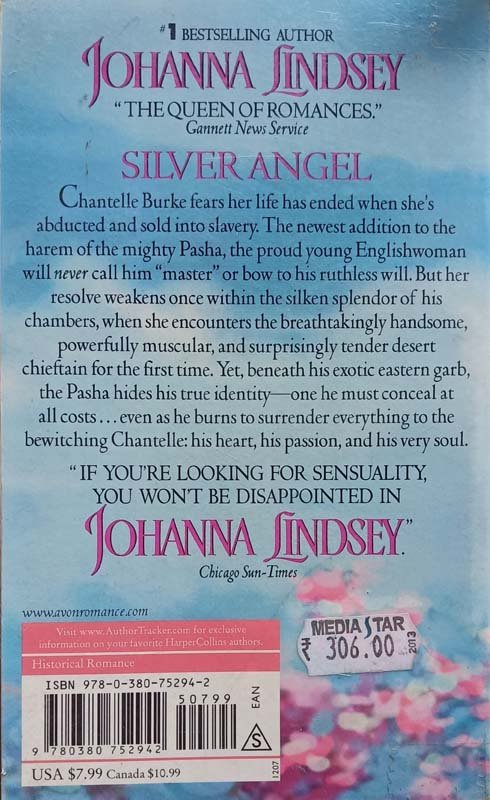 Johanna Lindsey continues her bestselling tradition with Silver Angel. Set in 18th-century England and Turkey, Silver Angel is a blistering blockbuster of soul-searing love in a forbidden paradise--a novel certain to reaffirm Lindsey's reputation as the top-ranking romance author! Abducted and sold into slavery, Chantelle Burke has been brought to the palace of the mighty Pasha. Vowing never to bow to this ruthless master′s will, the young Englishwoman weakens within the silken splendor of his chambers, and after on glance into his piercing emerald eyes. The stunningly handsome Pasha is a powerful, muscular figure yet he caresses the lovely addition to his harem with a fond tenderness that only succeeds in driving her wild. But beneath his exotic eastern garb, the cryptic Pasha shrouds his true identity -- one that he finds difficult to conceal when he wants so much to surrender his hearty and soul to the irresistible Chantelle.