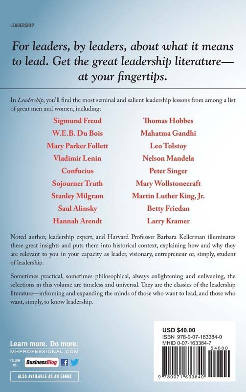 "Bravo to Barbara Kellerman! Building upon a lifetime of scholarship and upon a popular course she has created at Harvard, Kellerman brings between the covers of a single volume the world's classic literature on leadership. Every thoughtful leader will find deep, rich rewards here." -- David Gergen, Director, Center for Public Leadership Harvard Kennedy School, Former Presidential Adviser Bolster your leadership literacy—and improve your performance as a leader or manager.Leadership, says author, leadership expert, and Harvard Professor Barbara Kellerman, "is all about what leaders should learn—but it is decidedly not, deliberately not, about what leadership education has lately come to look like." Instead, Leadership is a concise yet expansive collection of great leadership literature that has stood the test of time. As Kellerman makes clear in her extensive, authoritative commentaries, every single selection has had, and continues to have, an impact on how and what we think about what it means to lead. And every single one has had an impact on leadership as an area of intellectual inquiry—as well as on the course of human history.
