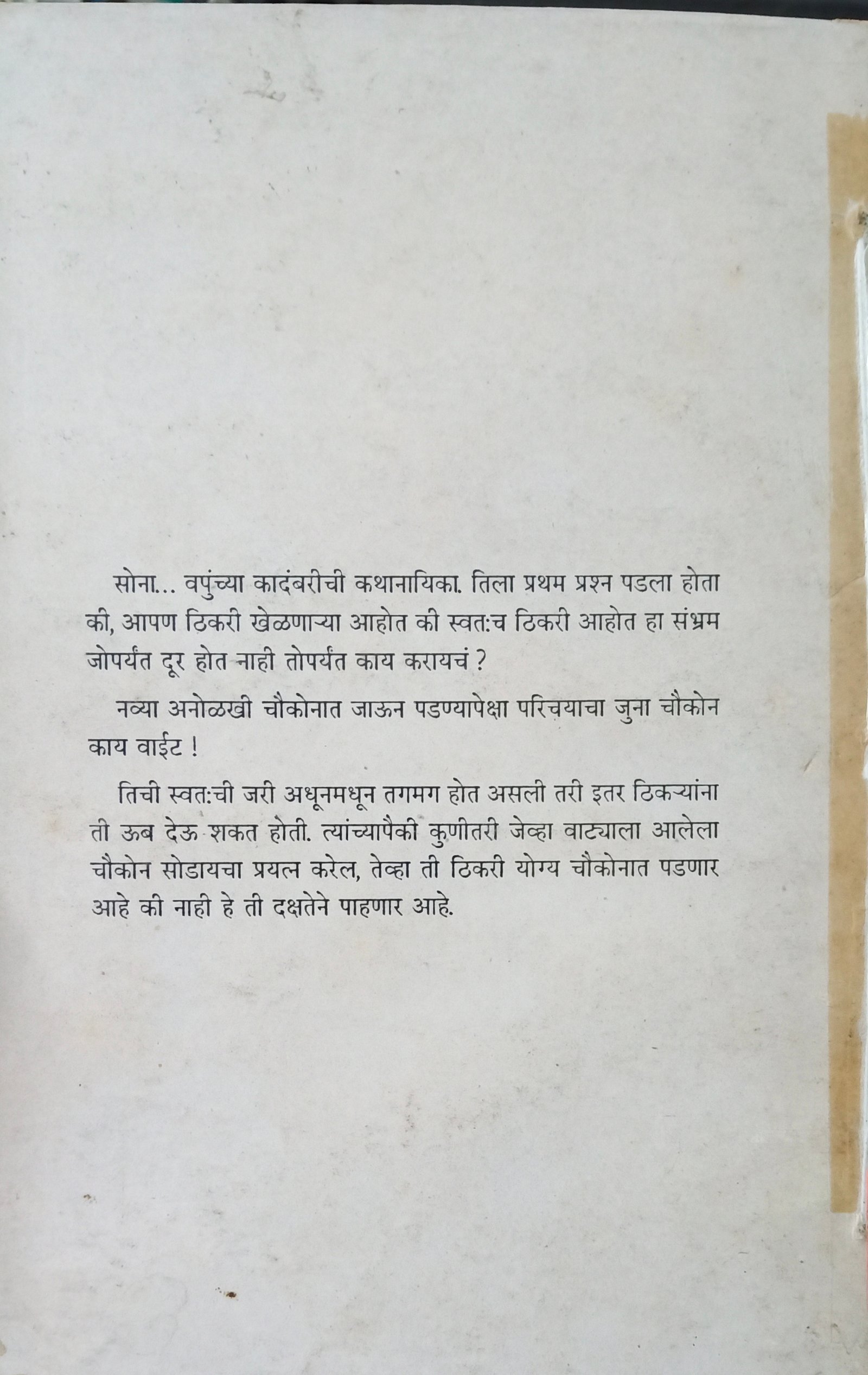 सोना... वपुंच्या कादंबरीची कथानायिका. तिला प्रथम प्रश्न पडला होता की, आपण ठिकरी खेळणाऱ्या आहोत की स्वत:च ठिकरी आहोत हा संभ्रम जोपर्यंत दूर होत नाही तोपर्यंत काय करायचं? नव्या अनोळखी चौकोनात जाऊन पडण्यापेक्षा परिचयाचा जुना चौकोन काय वाईट! तिची स्वत:ची जरी अधूनमधून तगमग होत असली तरी इतर ठिकऱ्यांना ती ऊब देऊ शकत होती. त्यांच्यापैकी कुणीतरी जेव्हा वाट्याला आलेला चौकोन सोडायचा प्रयत्न करेल, तेव्हा ती ठिकरी योग्य चौकोनात पडणार आहे की नाही, हे ती दक्षतेने पाहणार आहे.