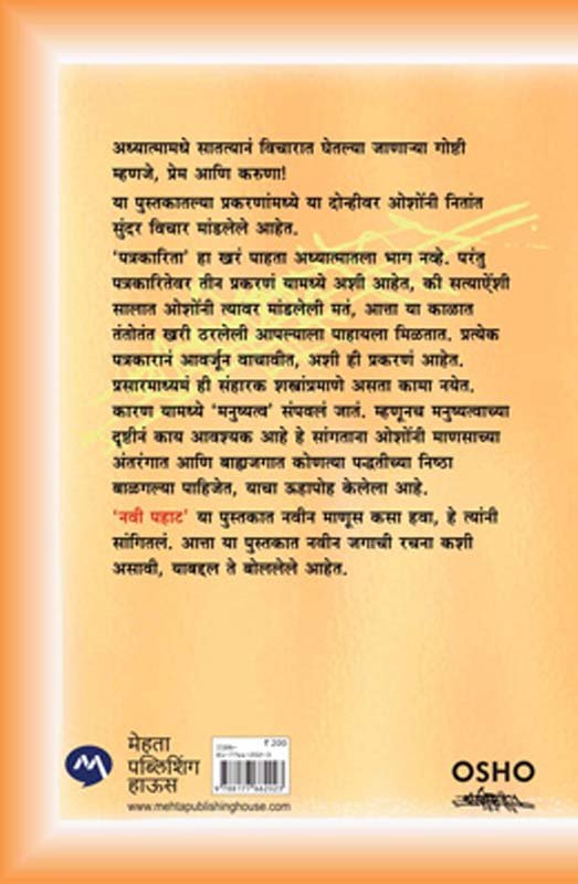 अध्यात्मामधे सातत्यानं विचारात घेतल्या जाणाया गोष्टी म्हणजे, प्रेम आणि करुणा! या पुस्तकातल्या प्रकरणांमध्ये या दोन्हीवर ओशोंनी नितांत सुंदर विचार मांडलेले आहेत. ‘पत्रकारिता’ हा खरं पाहता अध्यात्मातला भाग नव्हे. परंतु पत्रकारितेवर तीन प्रकरणं यामध्ये अशी आहेत, की सत्याऐंशी सालात ओशोंनी त्यावर मांडलेली मतं, आत्ता या काळात तंतोतंत खरी ठरलेली आपल्याला पाहायला मिळतात. प्रत्येक पत्रकारानं आवर्जून वाचावीत, अशी ही प्रकरणं आहेत. प्रसारमाध्यमं ही संहारक शस्त्रांप्रमाणे असता कामा नयेत. कारण यामध्ये ‘मनुष्यत्व’ संपवलं जातं. म्हणूनच मनुष्यत्वाच्या दृष्टीनं काय आवश्यक आहे हे सांगताना ओशोंनी माणसाच्या अंतरंगात आणि बाह्यजगात कोणत्या पद्धतीच्या निष्ठा बाळगल्या पाहिजेत, याचा ऊहापोह केलेला आहे. ‘नवी पहाट’ या पुस्तकात नवीन माणूस कसा हवा, हे त्यांनी सांगितलं. आत्ता या पुस्तकात नवीन जगाची रचना कशी असावी, याबद्दल ते बोललेले आहेत.
