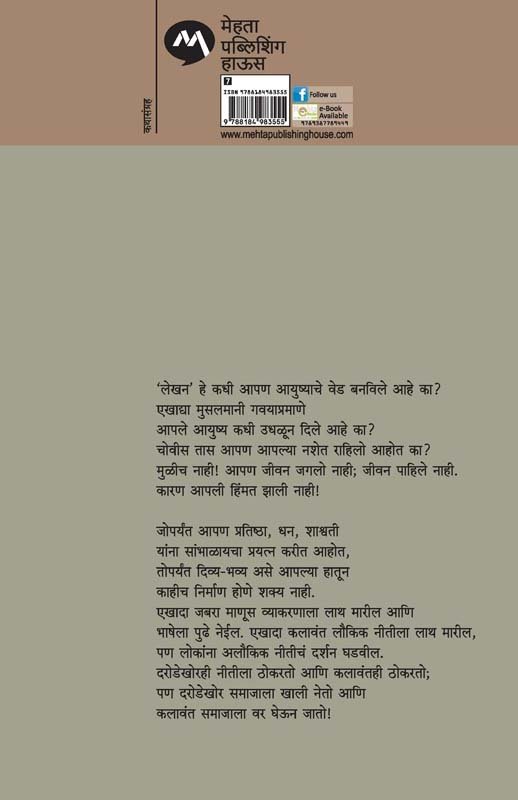 ‘लेखन’ हे कधी आपण आयुष्याचे वेड बनविले आहे का? एखाद्या मुसलमानी गवयाप्रमाणे आपले आयुष्य कधी उधळून दिले आहे का? चोवीस तास आपण आपल्या नशेत राहिलो आहोत का? मुळीच नाही! आपण जीवन जगलो नाही; जीवन पाहिले नाही. कारण आपली हिंमत झाली नाही! जोपर्यंत आपण प्रतिष्ठा, धन, शाश्र्वती यांना सांभाळायचा प्रयत्न करीत आहोत, तोपर्यंत दिव्य-भव्य असे आपल्या हातून काहीच निर्माण होणे शक्य नाही. एखादा जबर माणूस व्याकरणाला लाथ मारील आणि भाषेला पुढे नेईल. एखादा कलावंत लौकिक नीतीला लाथ मारील, पण लोकांना अलौकिक नीतीचं दर्शन घडवील. दरोडेखोरही नीतीला ठोकरतो; पण दरोडेखोर समाजाला खाली नेतो आणि कलावंत समाजाला वर घेऊन जातो!